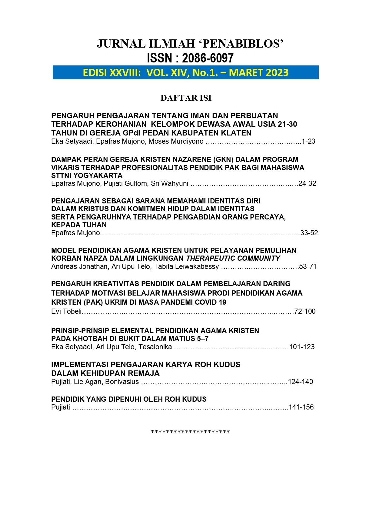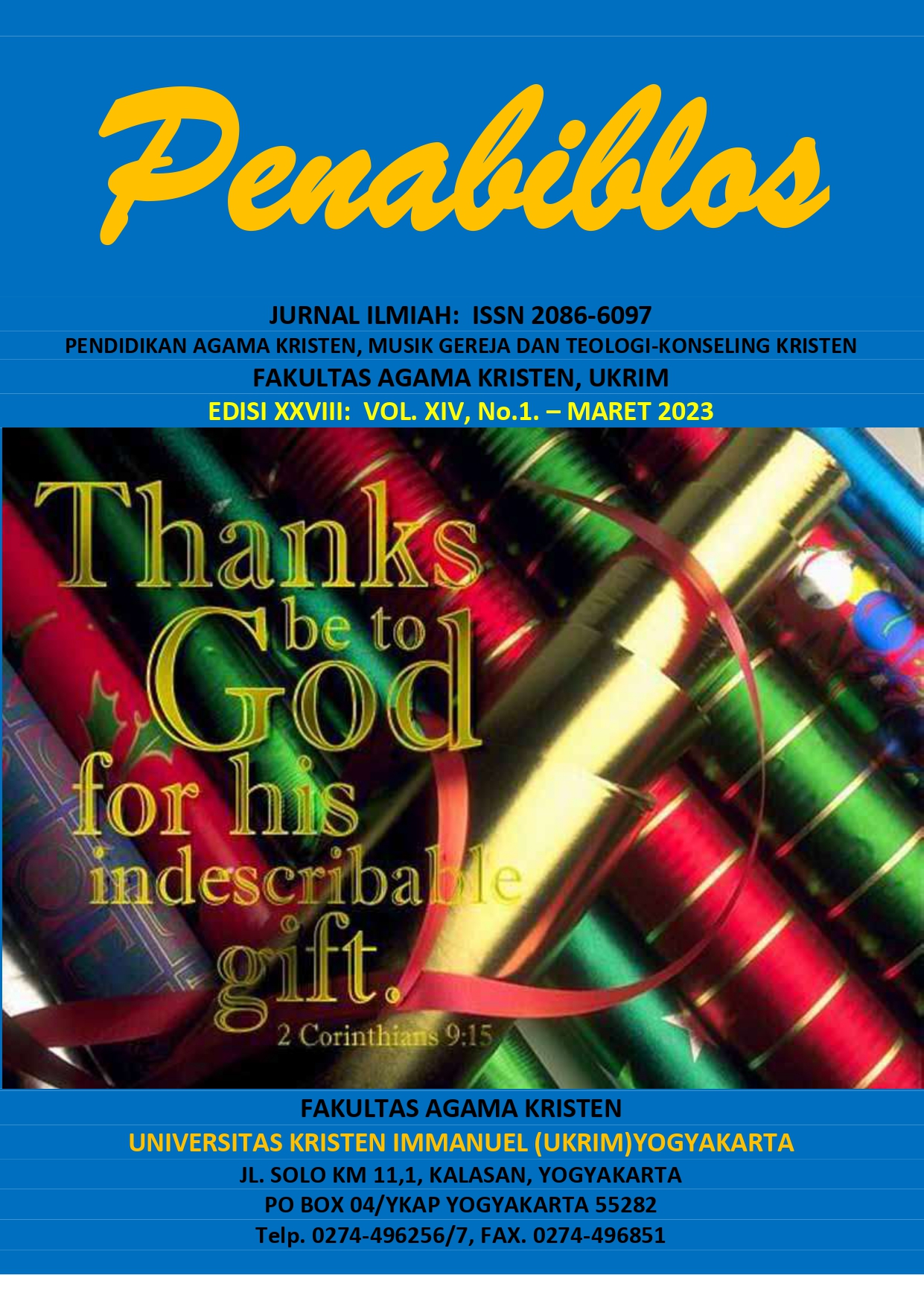 JURNAL PENABIBLOS merupakan jurnal Pendidikan agama kristen, musik gereja dan teologi konseling kristen yang dikelola oleh prodi S2 PAK UKRIM. Edisi XXVlll: Vol XlV, No I Maret 2023