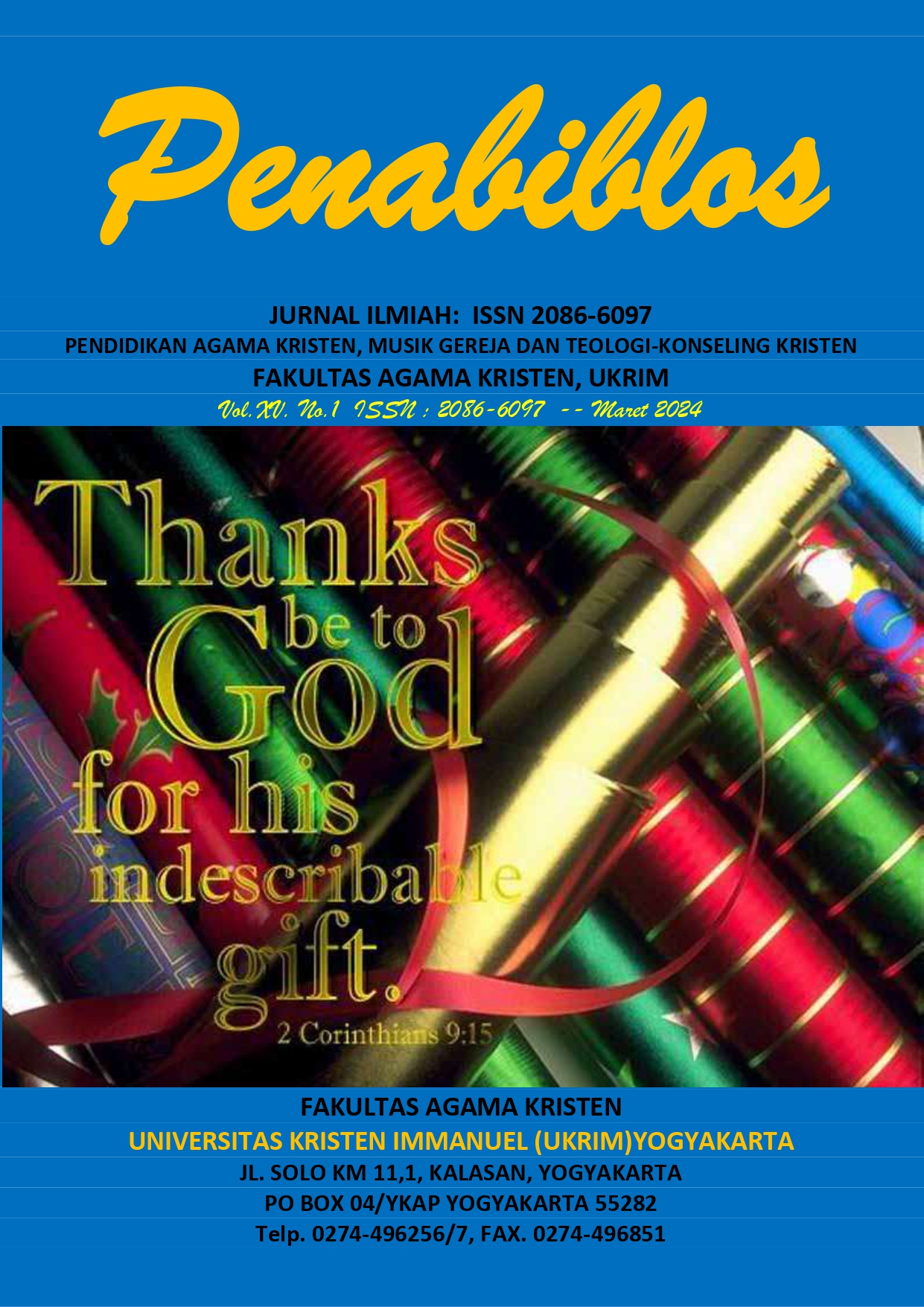 JURNAL PENABIBLOS merupakan jurnal Pendidikan agama kristen, musik gereja dan teologi konseling kristen yang dikelola oleh prodi S2 PAK UKRIM. Edisi XXlX: Vol XV, No 1 Maret 2024